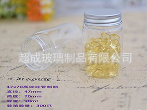 此款规格为直径44mm,口径40mm,高度89mm,容量70ml。原材料采用优质高硼硅玻璃,制作工艺为管制。款玻璃瓶主要用于高档保健品,虫草含片,玛咖精片,鹿茸胶囊,参茸,山参片,虫草粉,蜂胶,鱼油,燕窝,海参等高档奢饰品。